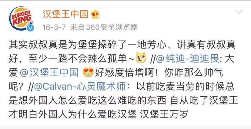 在微博上,上校爷爷和麦叔叔早已跃身成为坐拥百万粉丝的大V,汉堡王中国的粉丝数量,却仅仅是前者零头的水平。
