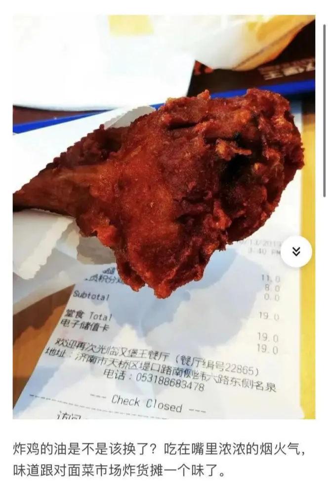 除去口味,有时所出售的食物品控并不一致,比如炸鸡肉眼可见的炸糊了,分明是没有严格把控烹制时间,而这在标准化的快餐行业里是大忌。