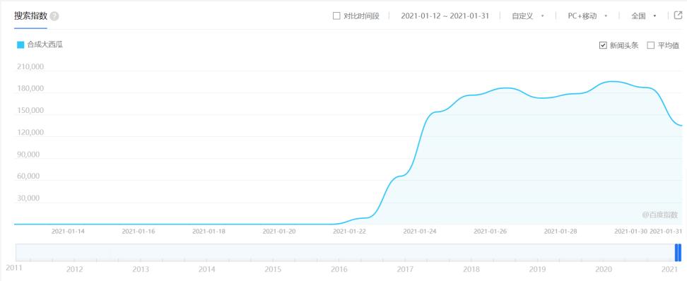 2021年1月最后一周,名为《合成大西瓜》的小游戏长居微博热搜榜,相关话题阅读量高达17.2亿,讨论量达42.7万次。同时,其百度指数更是从1月21日的0飞升跃至1月29日的195485,几乎呈指数式攀升。