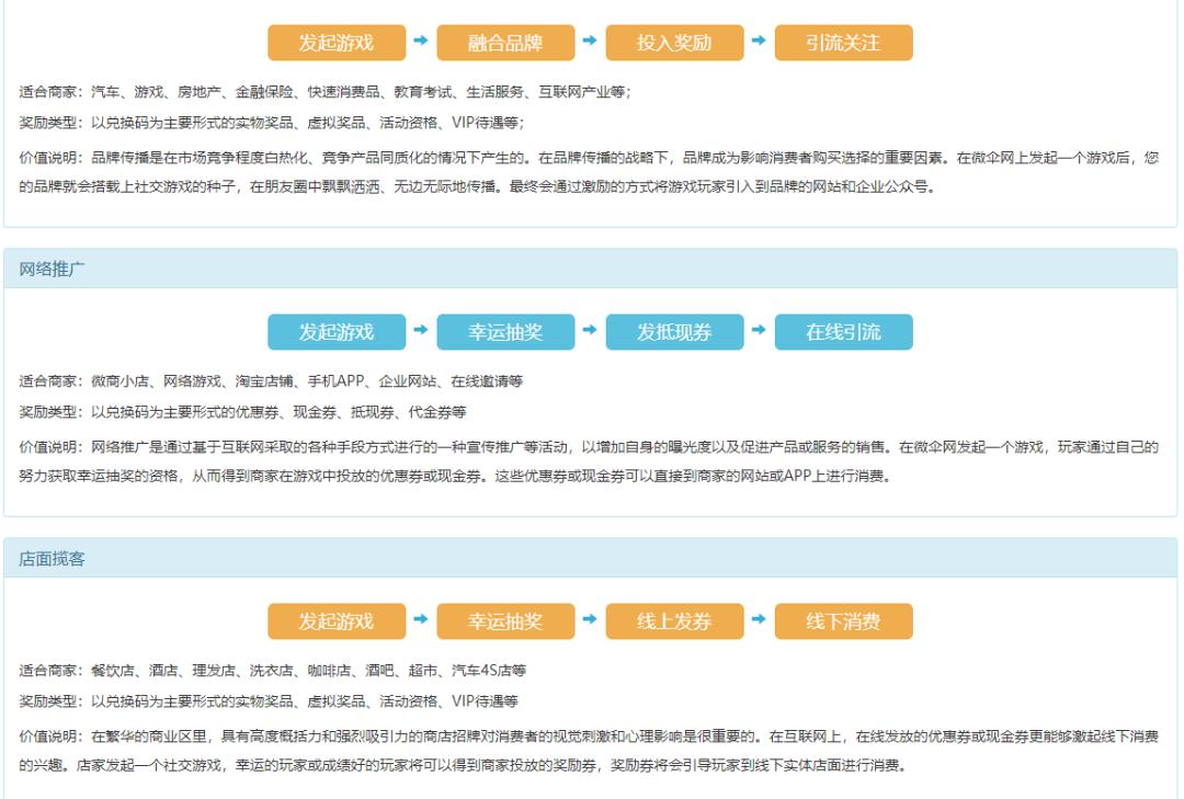 微伞游戏绕过了常规路径,改为给品牌服务。从官网的宣传来看也是如此,微伞游戏对自己的定位并非一家小微游戏厂商,而是基于游戏形式为品牌、厂家进行推广的营销平台。其宣传语更是直白地打出来口号:“想通过手机小游戏在微信中传播品牌和互动营销吗?来微伞只需3分钟就可以创建一个市场推广活动。”