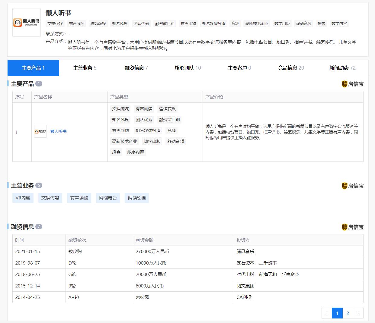 而根据澎湃新闻的报道,懒人听书成立于2012年,是一个为用户提供有声书、相声评书、播客以及其他电台节目的音频平台,旗下拥有包括《红色家书》《大江大河》《白鹿原》《庆余年》《斗罗大陆》《斗破苍穹》等在内的原创IP有声作品。其盈利模式包括单点付费、会员付费以及广告等。