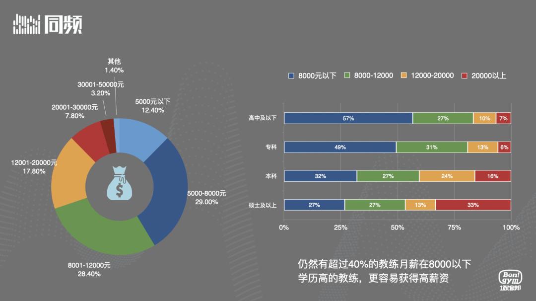 此次参与调研的健身教练中,大专本科及以上的学历占比80%以上,这个数据会比行业平均水平略高一些,也代表关注练吧的教练们平均文化水平较高。