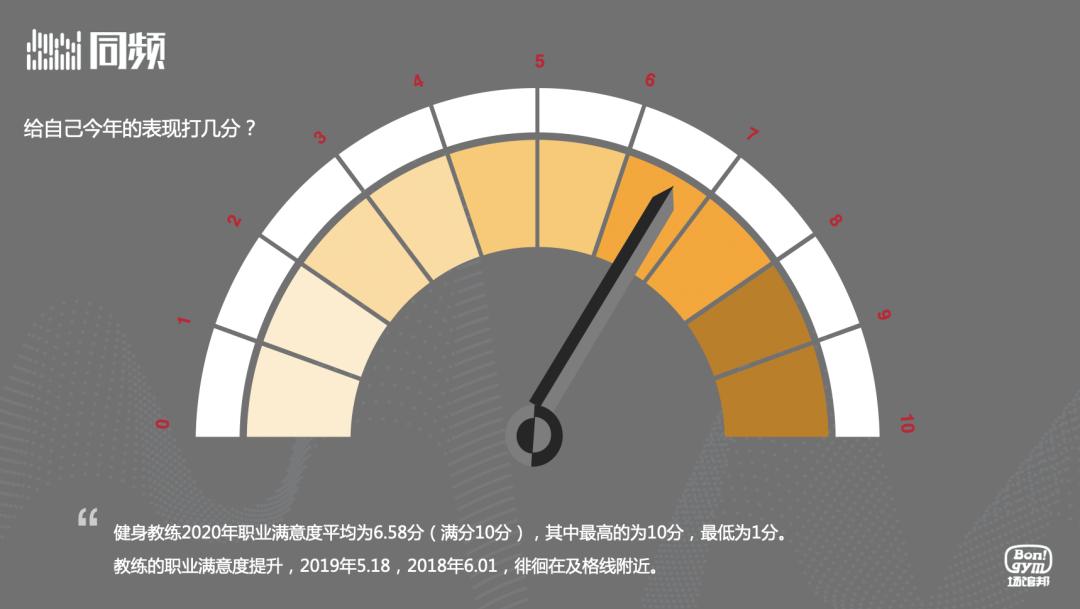 今年健身教练的职业满意度仍然保持在及格线以上(6.58分,满分10分),虽然经过了疫情的洗礼,对很多教练的正常工作产生了影响,但职业满意度却提升了,是否也体现了教练们对于工作的期望值有了更理性的认识呢?
