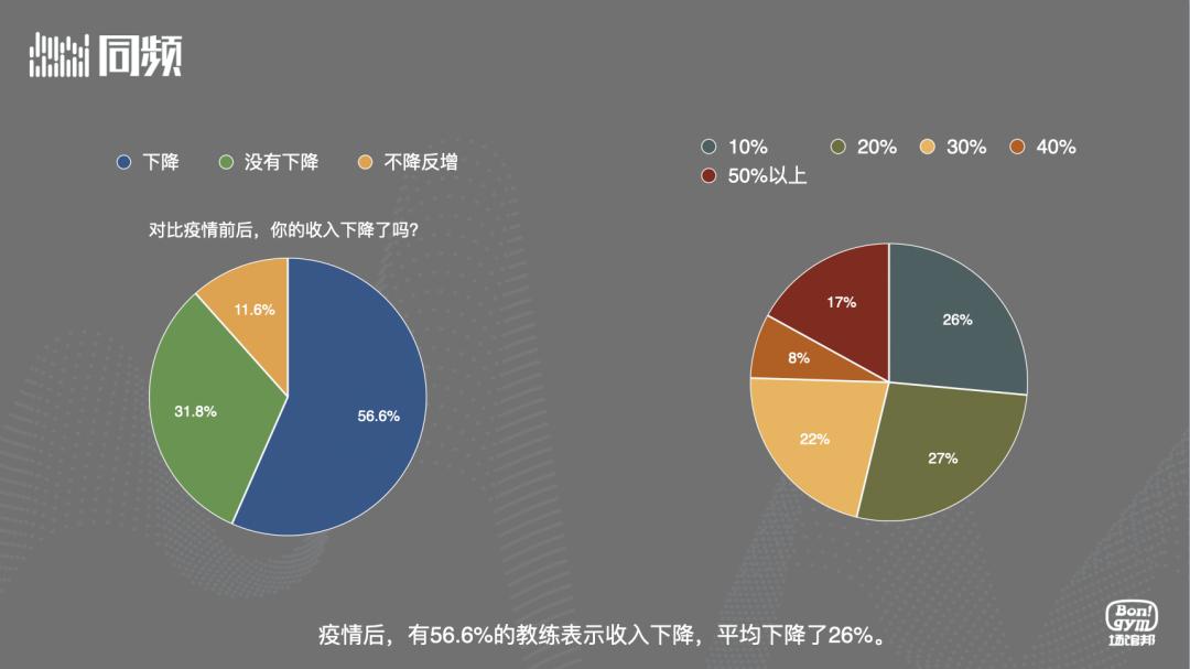 2020年,健身行业遭受了疫情的影响。疫情后,有56.6%的教练表示收入下降,平均下降了26%。