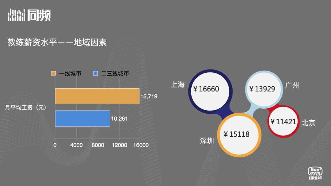 我们再从区域角度来比较,发现一线城市的教练平均收入为15719元,高于二三线城市的同行整整50%。而这其中,上海教练的平均月薪最高,为16660元,北京地区的教练工资垫底,为11421元。