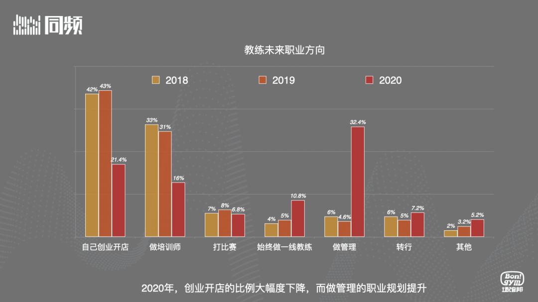 而今年教练职业规划的一大重要变化,则是“创业开店”比例的大幅度下降,而“做管理”的指向成为主流,另外选择待在一线做教练的比例也有翻倍的增长。