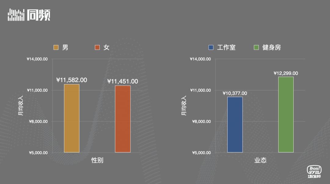 而从业态上看,健身俱乐部的教练收入(12299元)明显要高于工作室同行(10377元),这也能解释为何很多教练都抱怨健身房逼单严重工作压力大,却又不肯去工作室上班。