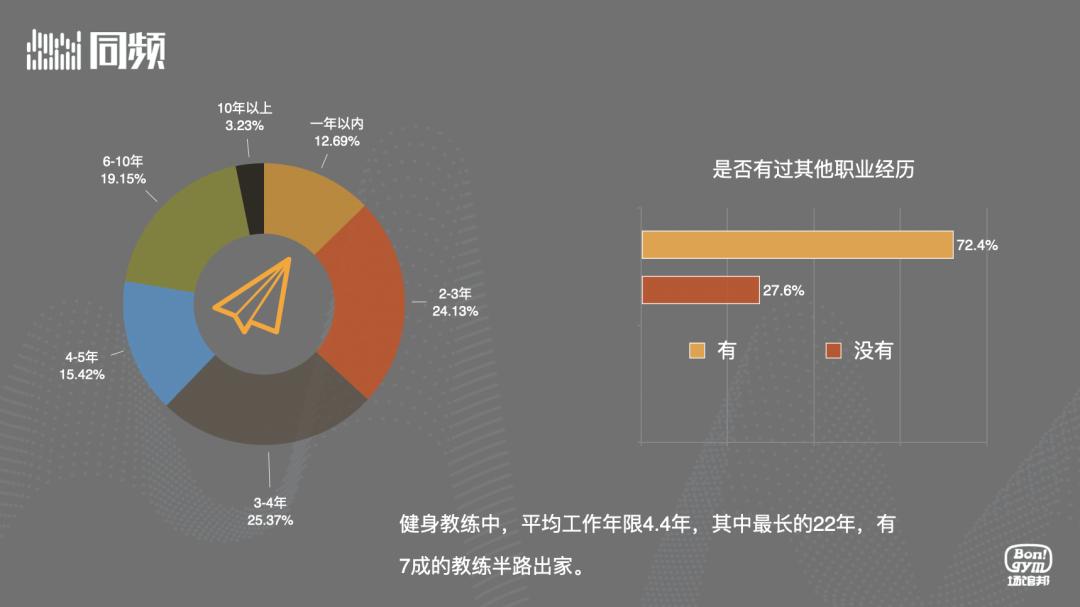 健身教练平均工作年限4.4年,其中最长的22年,有7成的教练半路出家。