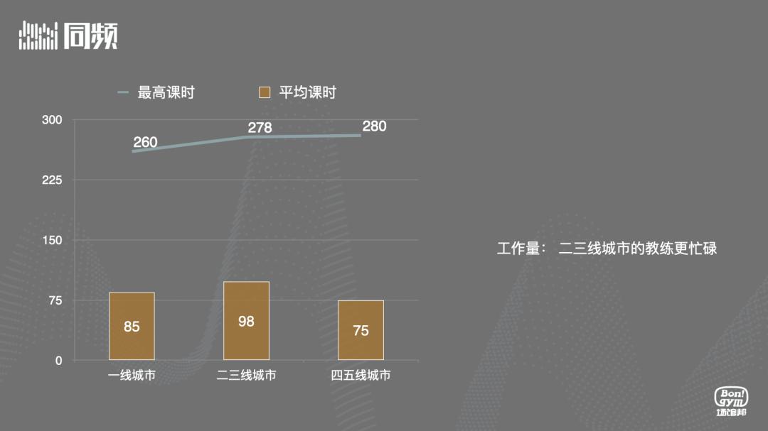 都说一线城市压力大,但调研数据显示,二三线城市的教练月均课时更高,达到98节,北上广深一线城市为85节,四五线城市教练则相对轻松,平均每个月上75节课。