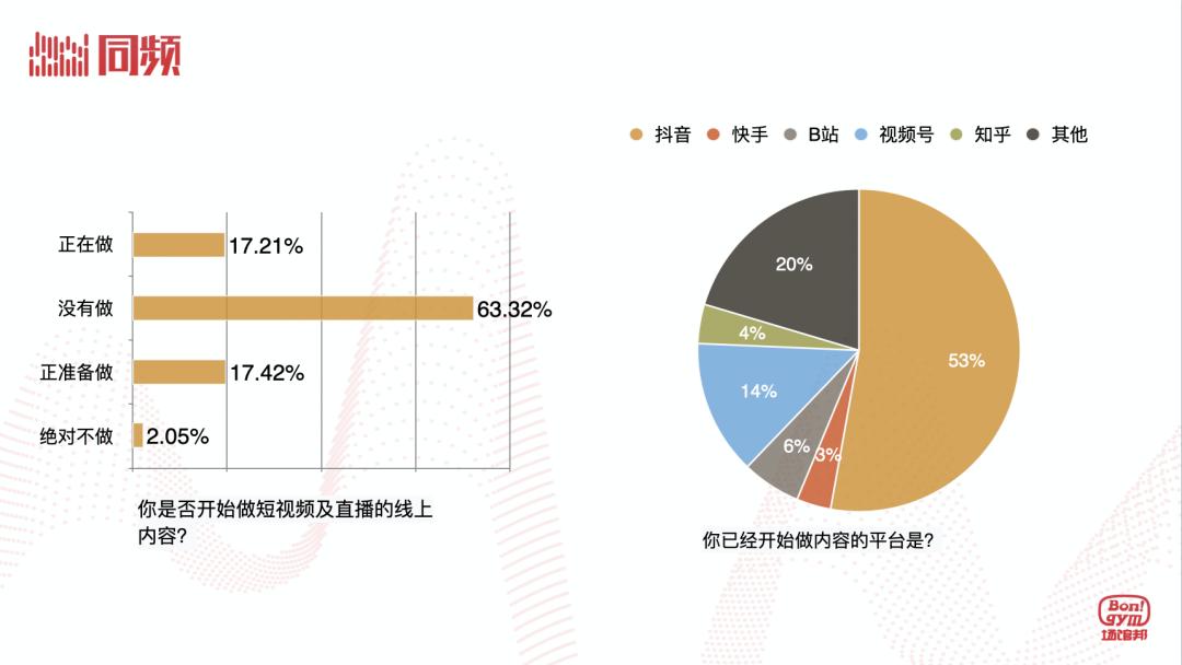 而对于去年异军突起的线上健身内容,很多教练都表达了浓厚的兴趣,但真正开始参与的却并不多。拥有6亿用户的抖音,也是教练们做内容的首选平台。