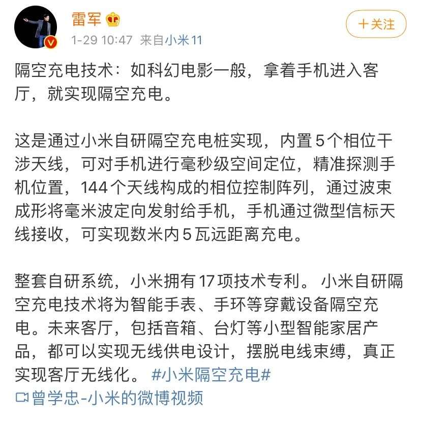 随后,小米董事长雷军也在微博上公布了小米的隔空充电技术,可实现数米半径内多设备5瓦远距离充电。