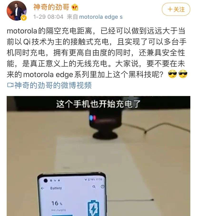 1月29日,联想中国区手机业务部总经理陈劲在微博上展示了摩托罗拉手机如何实现隔空充电,且支持多台手机同时充电。