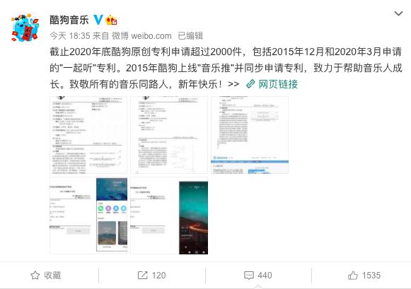酷狗音乐官方微博则晒出了自己的专利成绩:“截止2020年底酷狗原创专利申请超过2000件,包括2015年12月和2020年3月申请的一起听专利。2015年酷狗上线音乐推并同步申请专利,致力于帮助音乐人成长。”不过,其未正面回应网易云音乐的控诉。
