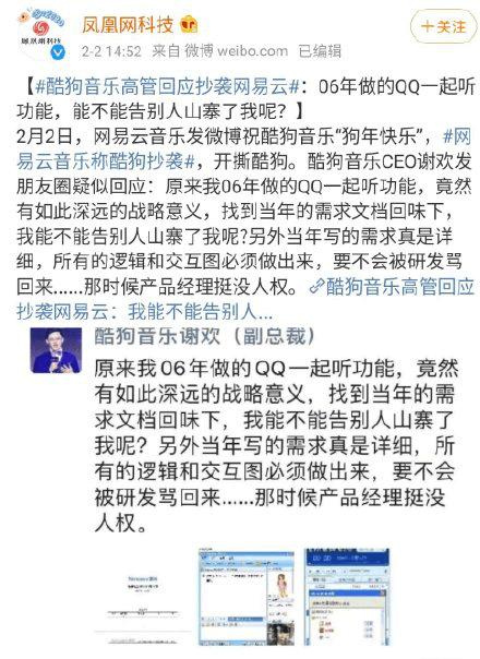 针对网易云音乐的控诉,酷狗音乐副总裁谢欢第一时间回应说,06年做QQ就有了“一起听”功能,他同时晒出当年的需求文档来证明这一点,并质疑自己是否可以告别人山寨?