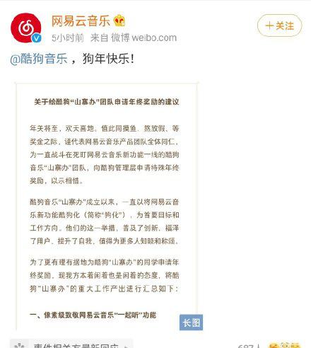 先是网易云音乐在官方微博发了一个长图,以《关于给酷狗“山寨办”团队申请年中奖励的建议》为题,图文并茂地控诉酷狗音乐“像素级”抄袭网易云音乐的“一起听”与“云贝推歌”功能。