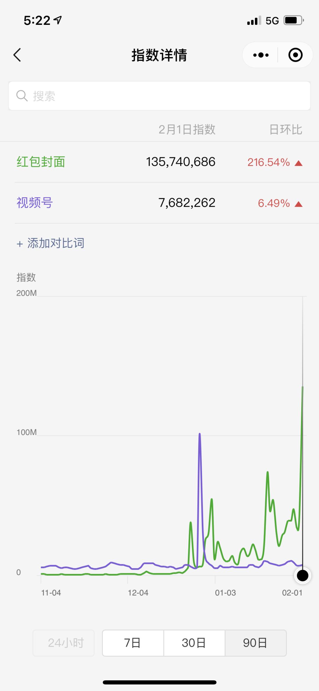 不过事情的发展似乎超出了微信的预料,尽管在微信红包封面的微信指数在十二月底与农历新年前屡创新高,在2月1日更是超过了1.3亿万,日环比高达216.54%,但视频号的微信指数除了12月28日突发破亿以外,其余时间都异常平静,停留在800万上下。