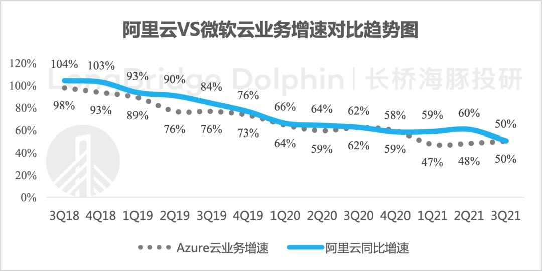 国际同行中,最近几年来,阿里云的增速一直稍高于Azure的增速,这个季度增长掉下来之后,已与行业老二Azure增速一致。