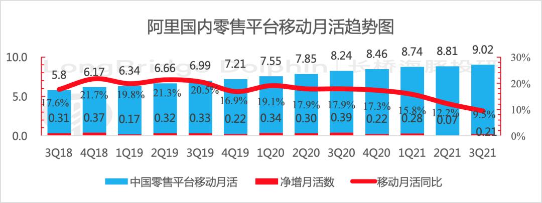b. 上个季度淘系App的月活比较令人忧心,这个季度小幅回归正常,单季净增2100万。这样,作为国内超级APP中的一员,淘系APP月活已过9亿 。
