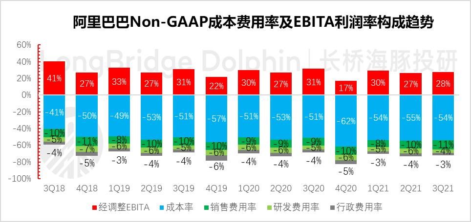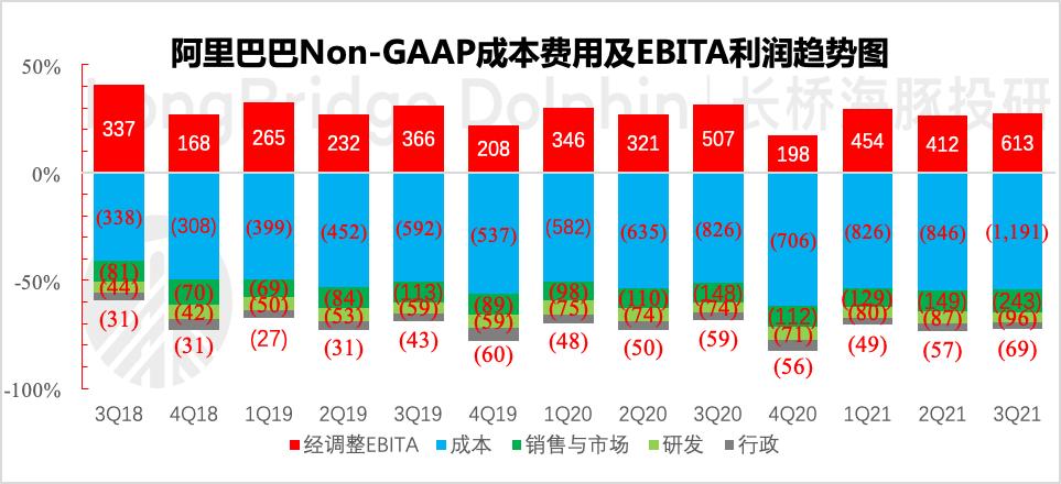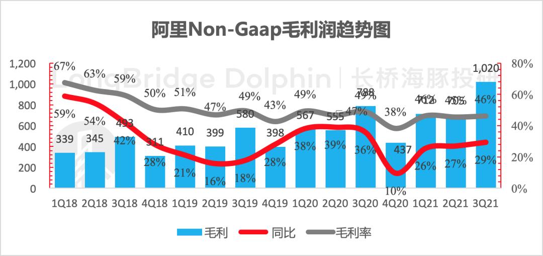 在成本与费用端上,阿里本季度剔除掉股权激励的Non-GaaP毛利增速29%,达到了1020亿;毛利率46%,小幅优于市场预期。