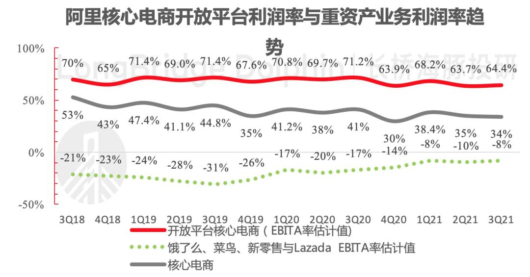 之前一直拖累公司利润表现的重资产业务(高鑫零售、饿了么、菜鸟、盒马、Lazada等自营业务)本财季表现基本稳定,亏损率8%,相对上季度的10%小幅改善。