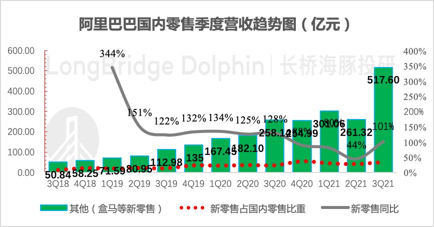 国内重资产零售业务主要包括盒马、高鑫零售、银泰、猫超自营、天猫国际自营部分与考拉。其中,本季度高鑫零售首次并表。本季度重资产零售业务本季度收入517亿,同比增长101%。