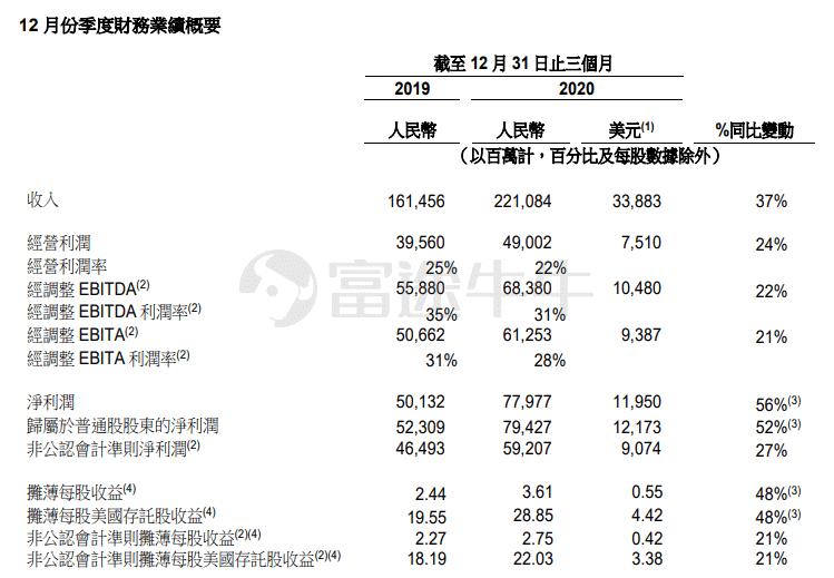 阿里第三财季经调整净利润592亿,同比增长27%;营收2210亿,同比增长37%