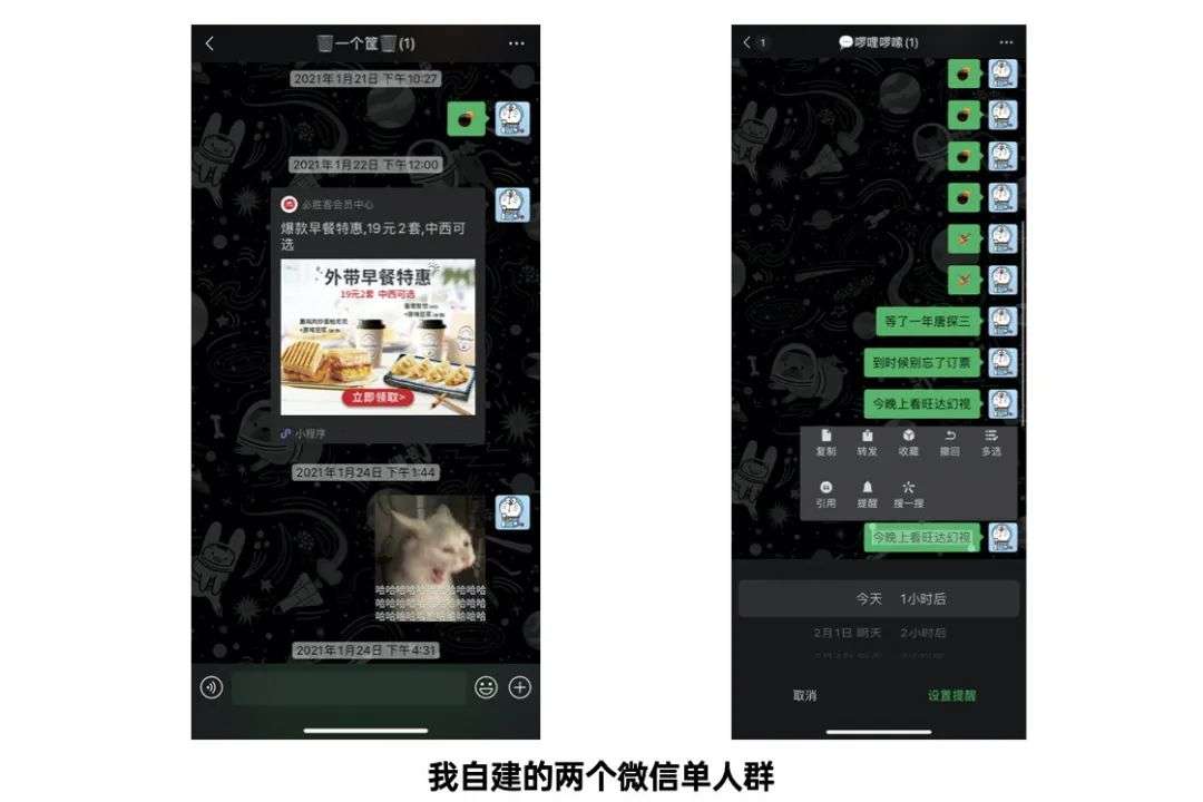 微信单人群算是很私人的一件乐趣之事,至于为什么选择微信,并不是因为它好用,只是因为微信占据了手机使用的大部分时间,选择微信只是为了方便记录。不想用微信自然也可以选在 Telegram 这样的 IM 工具,单人群的内核都是一样的。