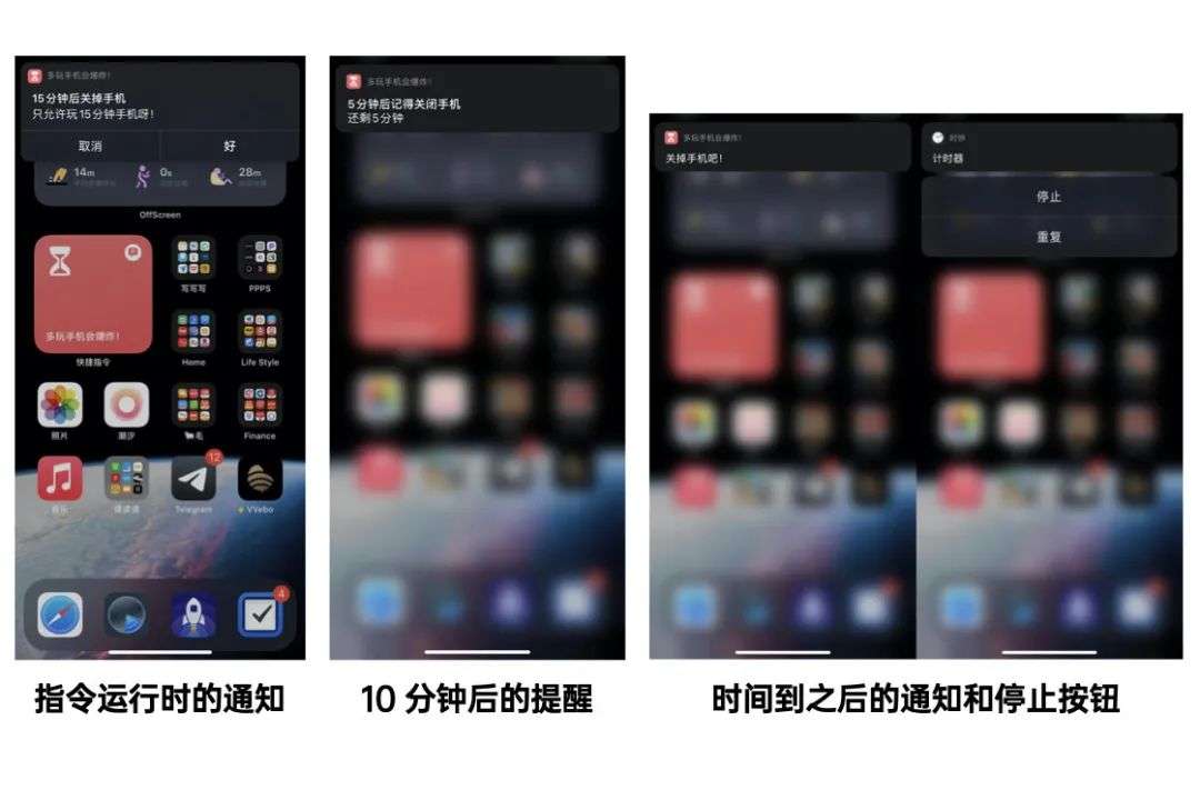 为了防止自己被手机这块强磁铁吸附住,我想到了一个办法来提醒刚解锁手机后准备闲逛的自己。这个办法其实很简单,用快捷指令设置一个用手机期限的倒计时,每次在无所事事玩手机时点击主屏幕上的大大的快捷指令小组件来运行。我给自己设置的是 15 分钟,时间到了之后,手机会发出提醒,第一次警告是在运行后的 10 分钟,第二次警告是在刷手机的 15 分钟后。这时候计时器结束,提示音和手机震动会持续运行,直到我点击停止并关闭手机。