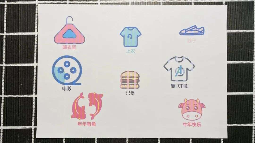 我打开看了一下后决定用一下它们。也恰逢我刚刚买了一台打印机,于是随便用 Keynote 做了一张图标大杂烩,用彩印打出来之后发现效果不错,就在今年沿用了这个方法。