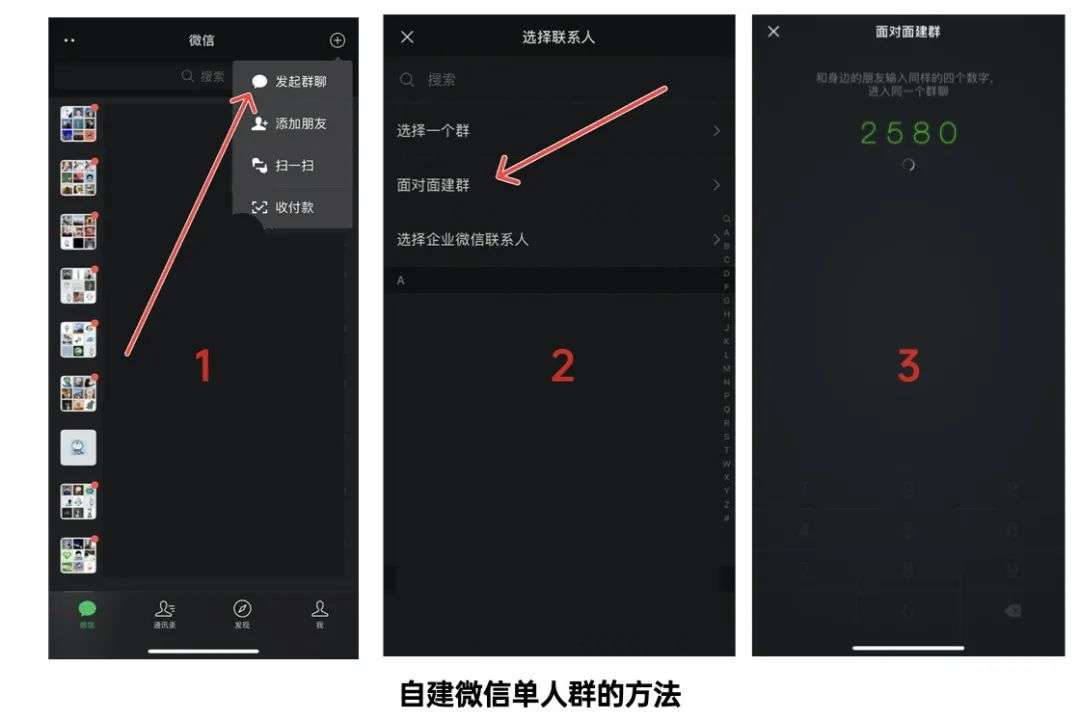 设置单人群的方法也非常简单:微信主界面点击右上角「+」号 - 发起群聊 - 面对面建群 - 随便输串数字 - 建群成功 - 设置置顶即可。