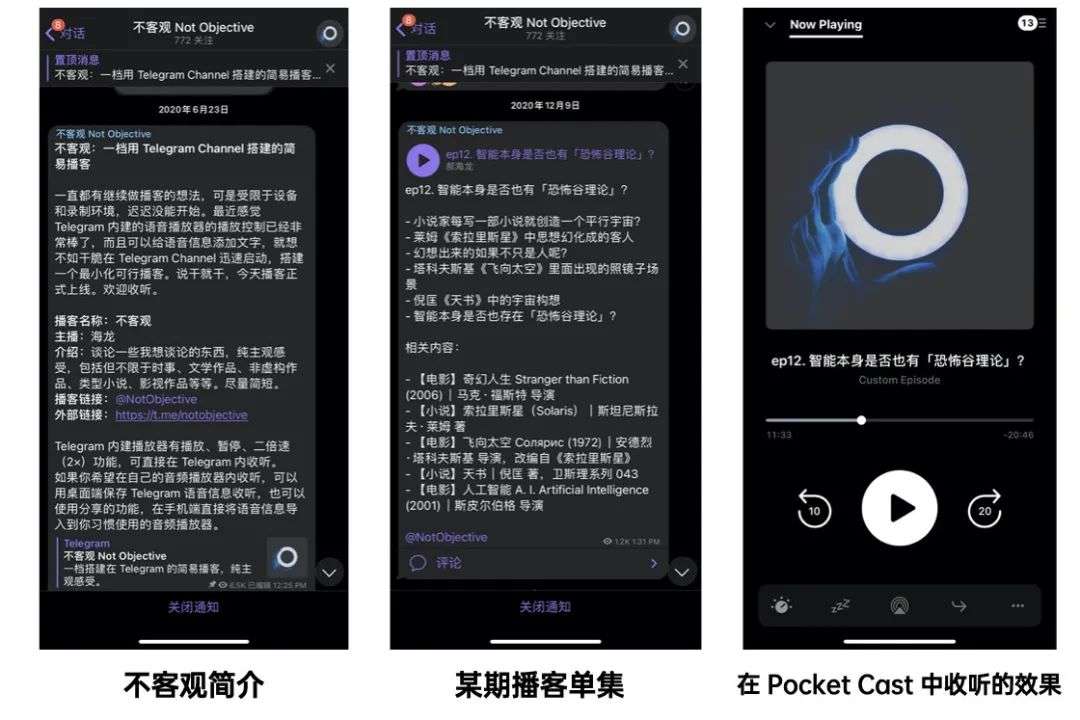 这个方法我是从郝海龙那里学到的,相信我派的读者对他应该很熟悉。《保持冷静》和《比特新声》停更很久后,我又遇到了海龙,他在上面创建了一个公开频道命名为「不客观 Not Objective」[1] 用来发布一些他想表达的内容,惊喜的是用声音呈现,我们可以直接在 app 内收听,进度条和倍速功能都支持,同样也可以导出到 Pocket Casts 这样的播客客户端收听。