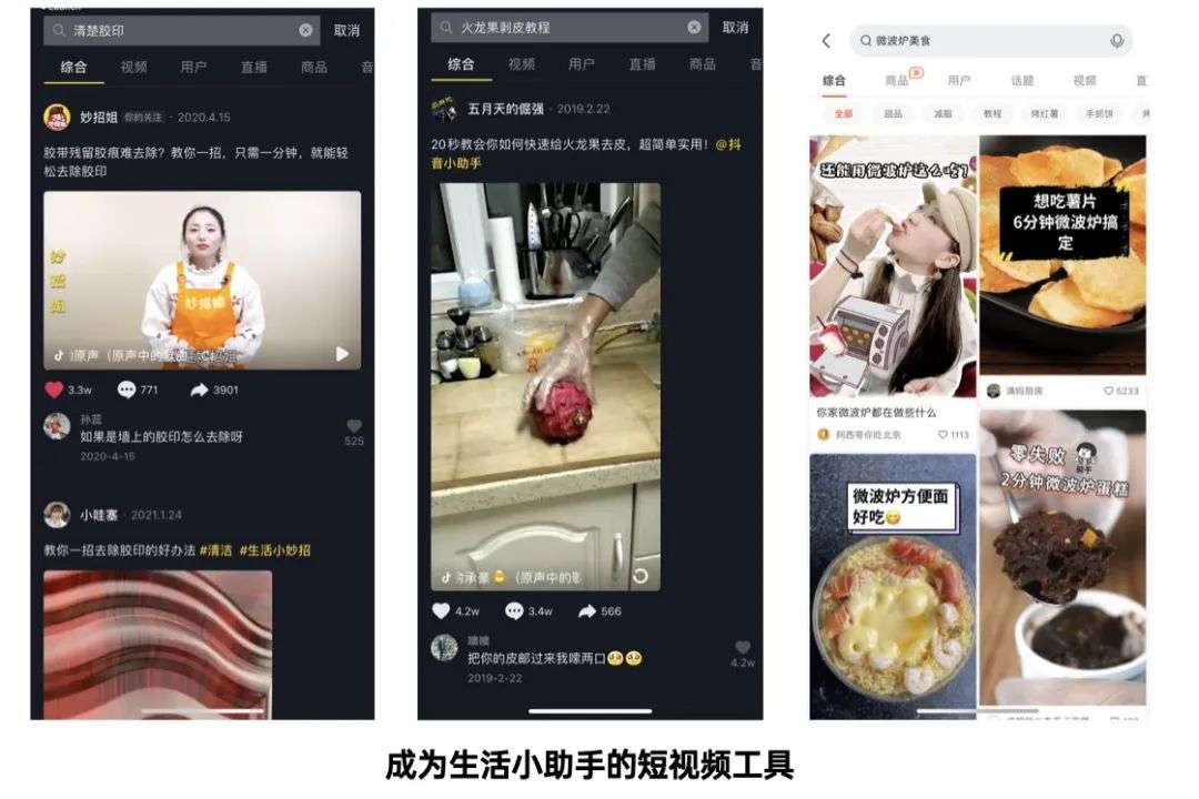 我用它在这一年中学到了许多小妙招:蒸蛋糕时的蛋清如何打、如何快速清除残留的强力胶印、火龙果如何快速去皮、西装在旅行时如何打包等等。每次遇到生活小问题需要解决时,打开短视频 app,搜索框中输入问题后看默认推荐的前三个视频基本就能解决这些小问题。短视频平台对于我的意义在此,它们被我扔在 App 资源库中,只有在有问题的时候以下拉搜索的方式打开。