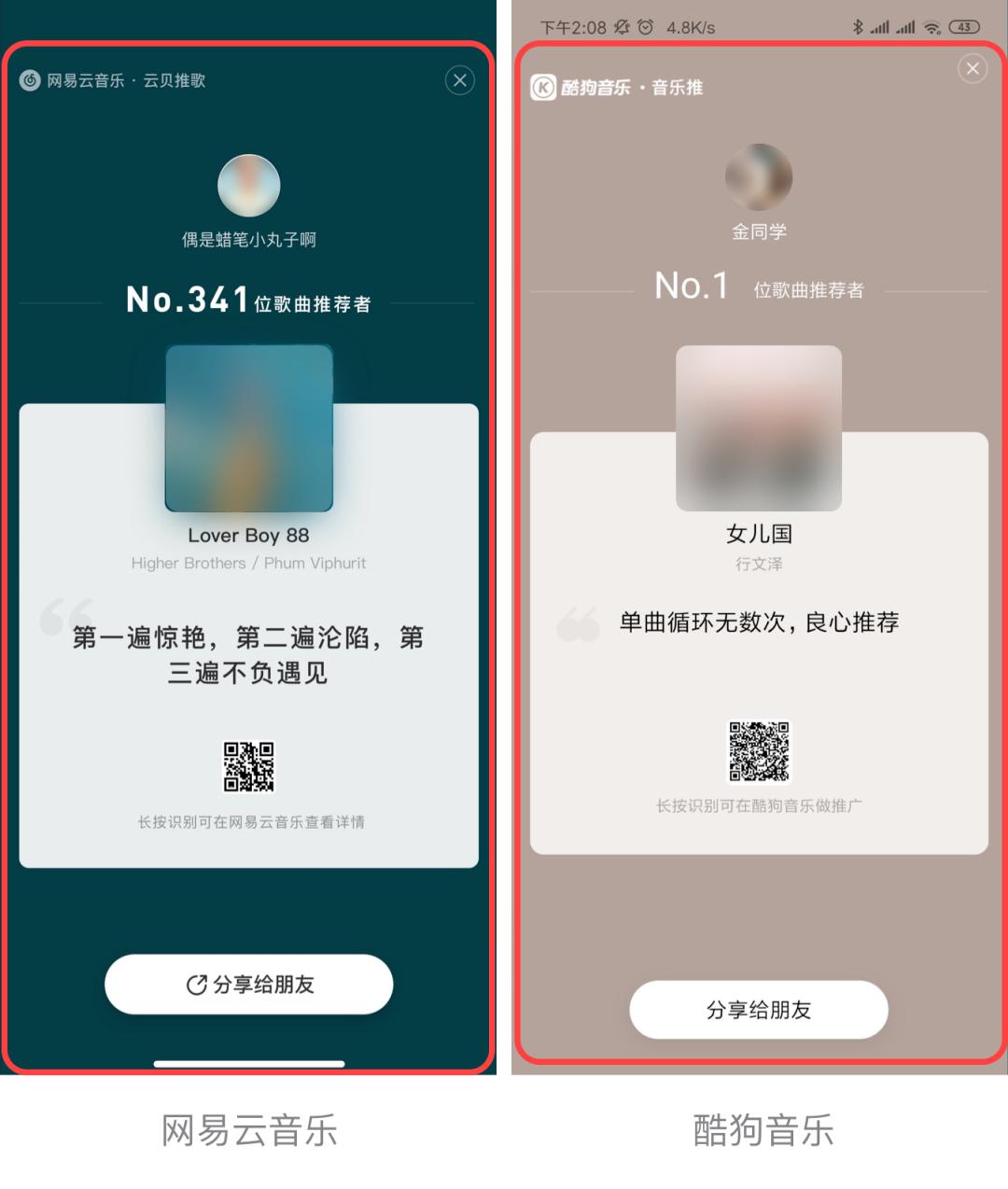 首先是功能,网易云音乐“称赞”酷狗方一直在致力于将网易云新功能“酷狗化”。2020年7月网易云上线了“一起听”功能,而酷狗也于近期上线“跟听”功能;网易云在2020年4月份上线“云贝推歌”功能,三个月后酷狗音乐上线“音乐推”功能。