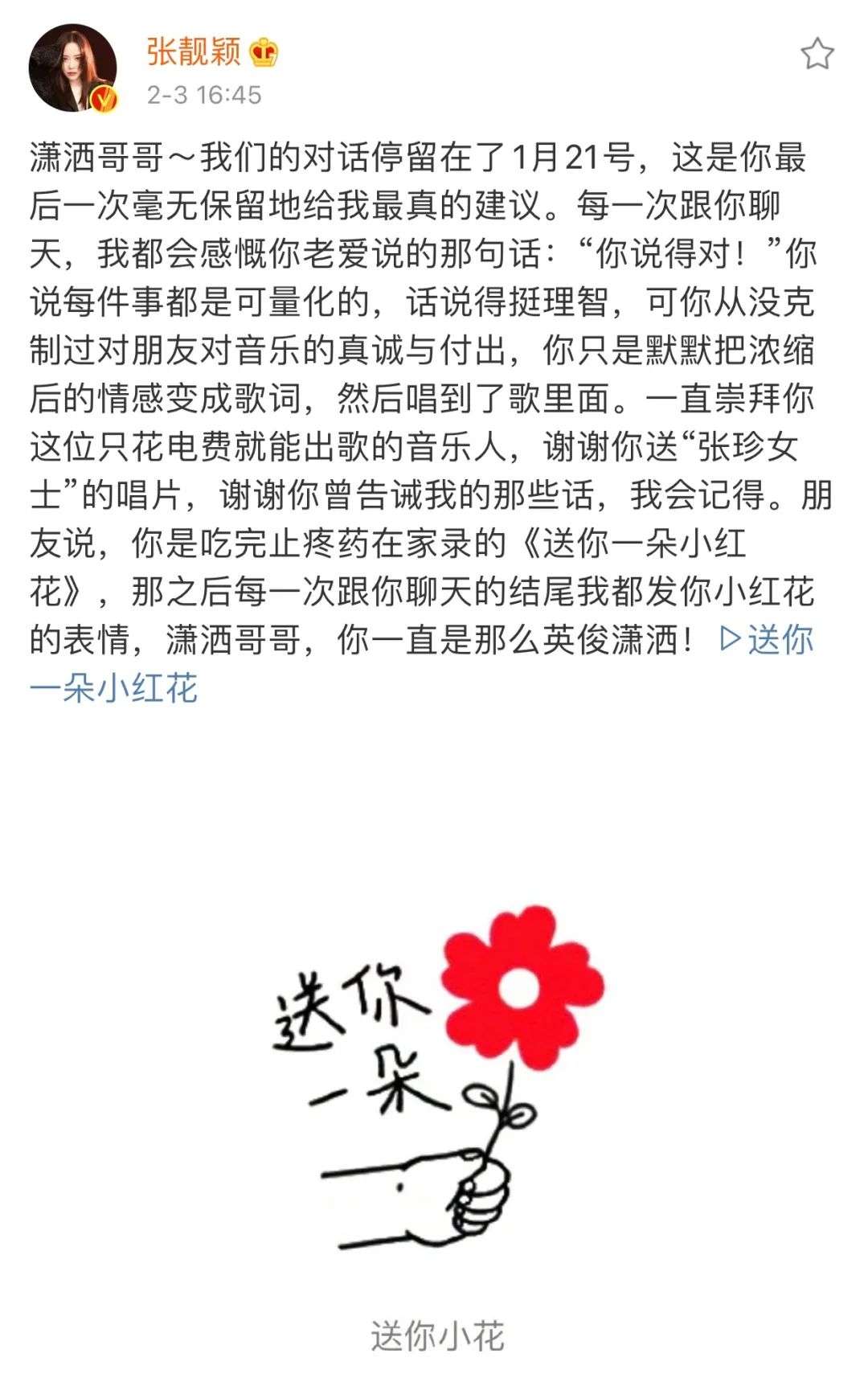 张靓颖则在微博中提到,“朋友说,你是吃完止疼药在家录的《送你一朵小红花》,