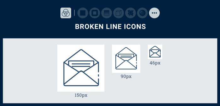 基本的线条图标看起来会很无聊,太简单。不管出于什么原因,其实只要把线条稍微打断一下就可以让图标更加个性话。有两种类型的虚线似乎很受欢迎;一似乎是在线条之间空出一块标准隔断(见左下图的星星)。二是在隔断中间加个点或线段(参见右下方的蛋糕图标)。
