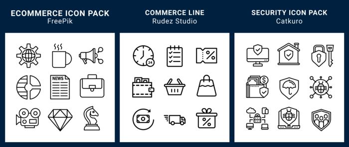 大尺寸线条图标示例。FreePik的ECommerce Icon Pack ,Rudez Studio的Commerce line, CatKuro的Security 。