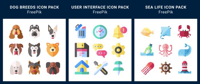 半色调平色图标集示例。FreePik的Dog Breeds Icon Pack , FreePik的User Interface Icon Pack , FreePik的Sea life Icon Pack 。