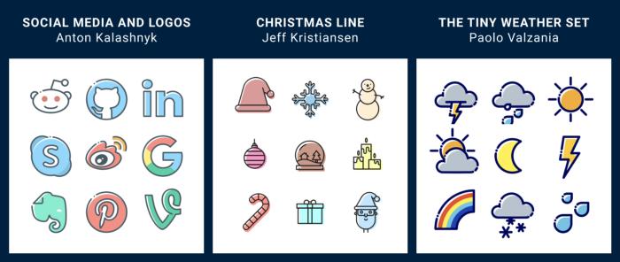 偏移填充背景的线条图标示例。Anton Kalashnyk的社交媒体与logo, Jeff Kristiansen的圣诞节专栏, Paolo Valzania的天气图标。