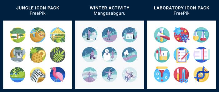 置于容器内扁平图标集示例。FreePik的Jungle Icon Pack , Mangsaabguru的Winter Activity , FreePik的Laboratory Icon Pack 。