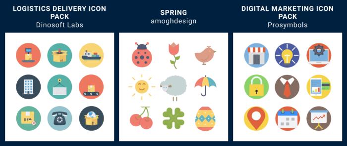 扁平图标示例。DinosoftLabs的Delivery Icon Pack , Amoghdesign的Spring, Prosymbols的Digital marketing Icon Pack 。