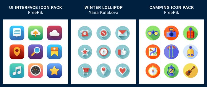 长阴影平色图标示例。FreePik的UI interface Icon Pack, Yana Kulakova的Winter Lollipop, FreePik的Camping Icon Pack。