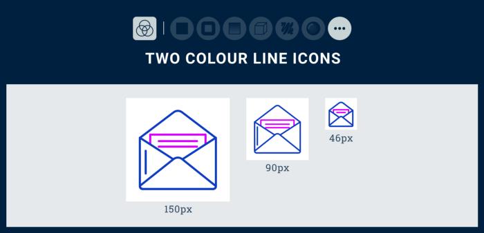这类图标的其中一个缺陷是,看起来会有点像“着色本”,但通过几条策略可以避免这种情况,那就是要注意线条的粗细、颜色调色板以及线条样式。在样式里面做出一些大胆的选择可以帮助你避免图标看起来像是品牌通用的东西(请参见下面的示例)。