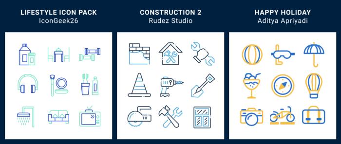 双色线条图标集。IconGeek26的Lifestyle Icon Pack,Rudez Studio的Construction 2 ,Aditya Apriyadi的Happy Holiday 。