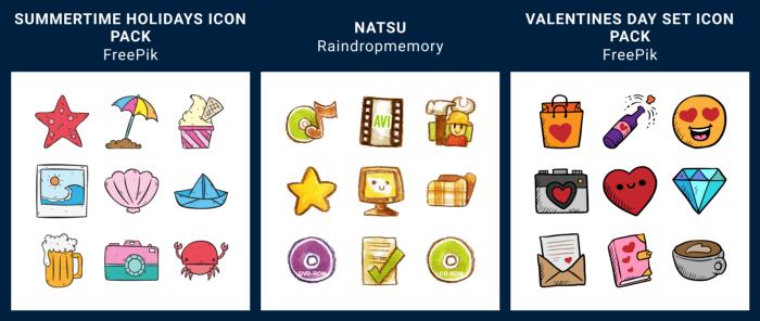 大尺寸手绘线条图标示例。FreePik的Summertime Holidays Icon Pack ,Raindropmemory的Natsu , FreePik的Valentines。