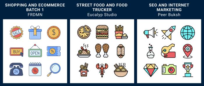 大尺寸实线图标的示例。FRDMN的Shopping and Ecommerce,Eucalyp Studio的Street Food and Food Trucker,Peer Buksh 的SEO and Internet Marketing。