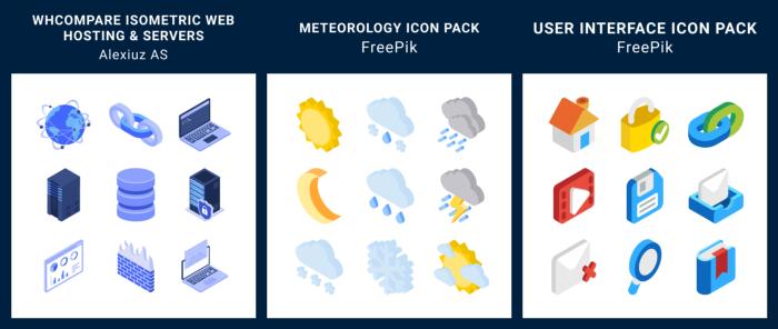彩色等距图标示例。Alexiuz AS的WHCompare Isometric Web Hosting & Servers, FreePik的Meteorology Icon Pack , FreePik的User Interface Icon Pack 。