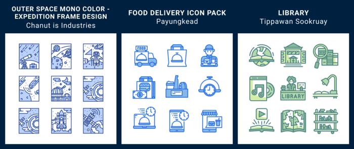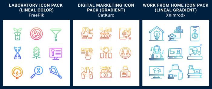 带有渐变的大线图标的示例:FreePik的Laboratory Icon Pack(线性颜色),CatKuro的Digital Marketing Icon Pack(梯度),Xnimrodx的在家工作Icon Pack(线性渐变)