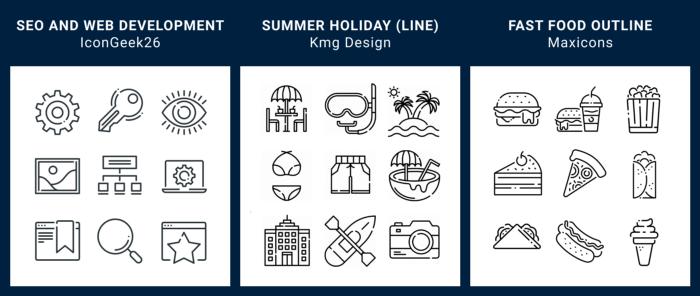 虚线图标集的示例。Anton Kalashnyk的搜索引擎优化与网站开发,,暑假(Line),Kmg Design的Summer Holiday,Maxicons的Fast food。