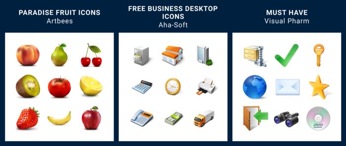 拟物图标集示例。Artbees的Paradise Fruit icons,Aha-Soft的Free Business Desktop Icons,Visual Pharm的Must Have。