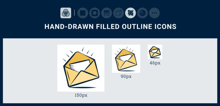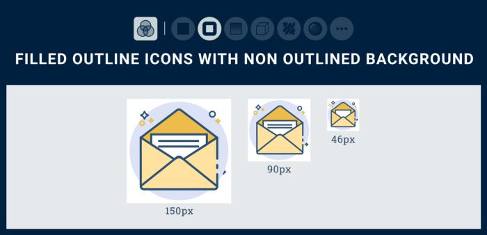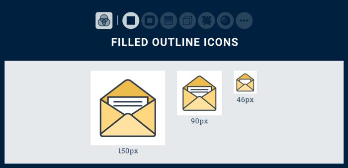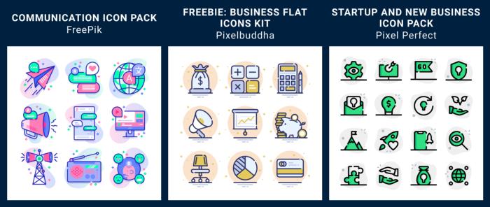 无轮廓背景 + 有轮廓图标示例。FreePik的Communication Icon Pack,Pixelbuddha的Freebie: Business Flat Icons Kit ,Pixel Perfect的New Business Icon Pack。